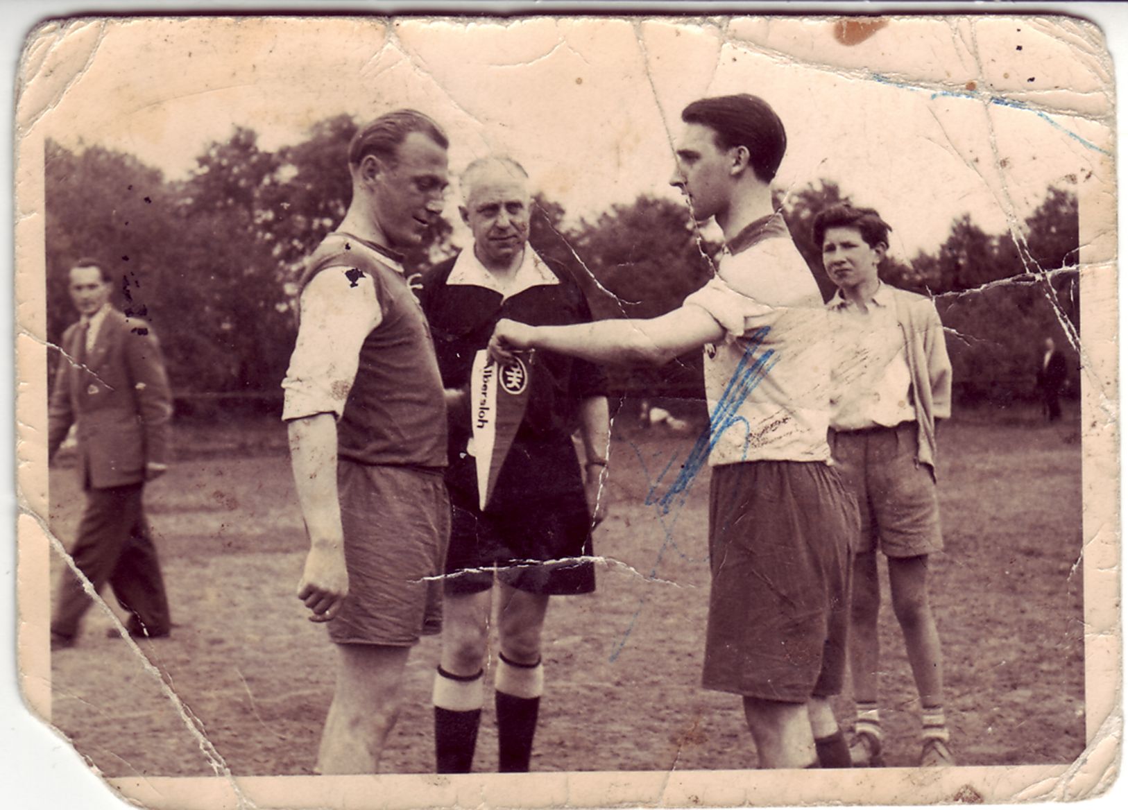 Heimspiel 1955 gegen Adler Münster. Kapitän "Bubi" Gengel begrüßt den Gast aus Münster